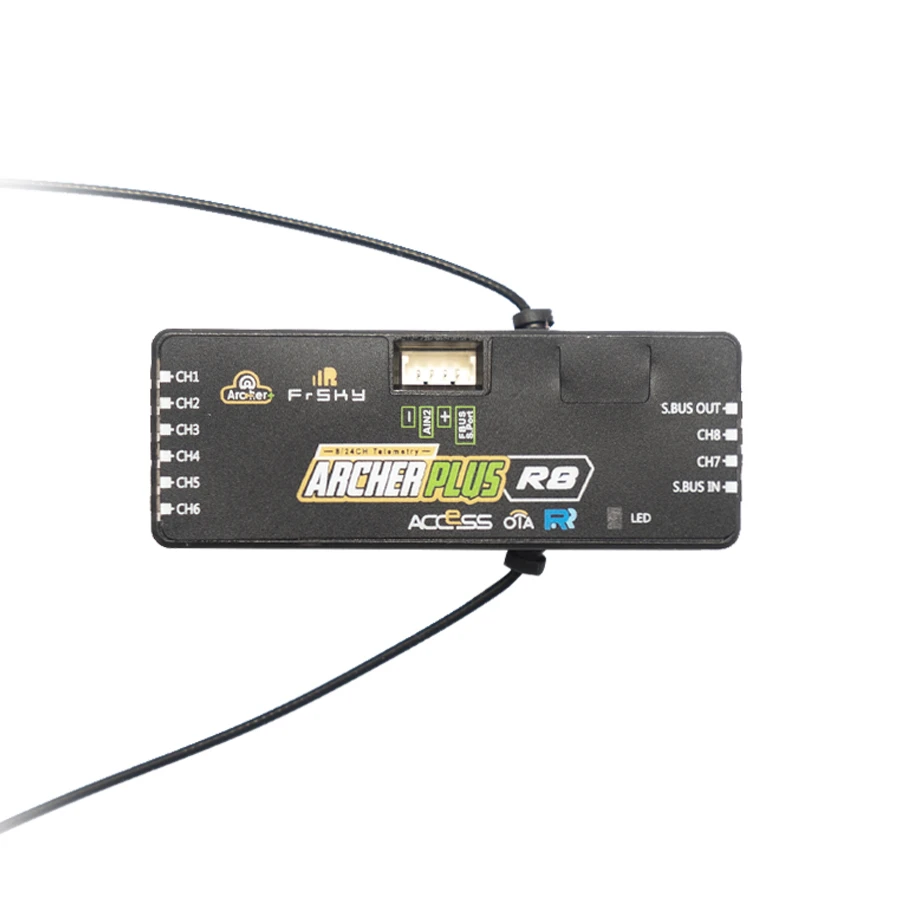 The FrSky Archer Plus R6 8 high-precision PWM channel receivers is ideal for any types of glider pilot, it supports full-range signal strength with dual detachable antennas and guarantees optimal antenna reception and range. The R6 can be used as a Primary receiver in a redundant solution by wiring the SBUS In port and connecting to any other FrSky receiver equipped with an SBUS Out port. With the FBUS protocol, the Archer Plus series receivers can open up the possibility of seamlessly pairing with multiple telemetry devices (XACT servos, ADV Sensors, etc.) as well as simplifying the builds setup.