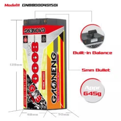 The GNB 1300mAh 6S 100C LiHV Battery is a high quality LiHV (High Voltage Lithium Polymer) battery manufacturered by Gaoneng, more commonly known as GNB. It features a rating of 100C for constant discharge upto 200C for short bursts. The battery is fitted with an XT60 connector and includes a JST-XH balance plug.