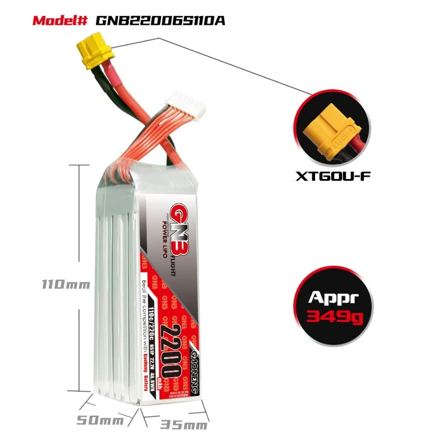 – Model: GNB 2200mAh 6S 110C LiPo Battery with XT60 connector.