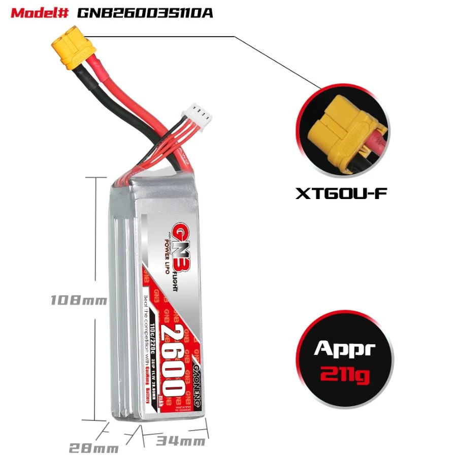 – Model: GNB 2600mAh 3S 110C LiPo Battery