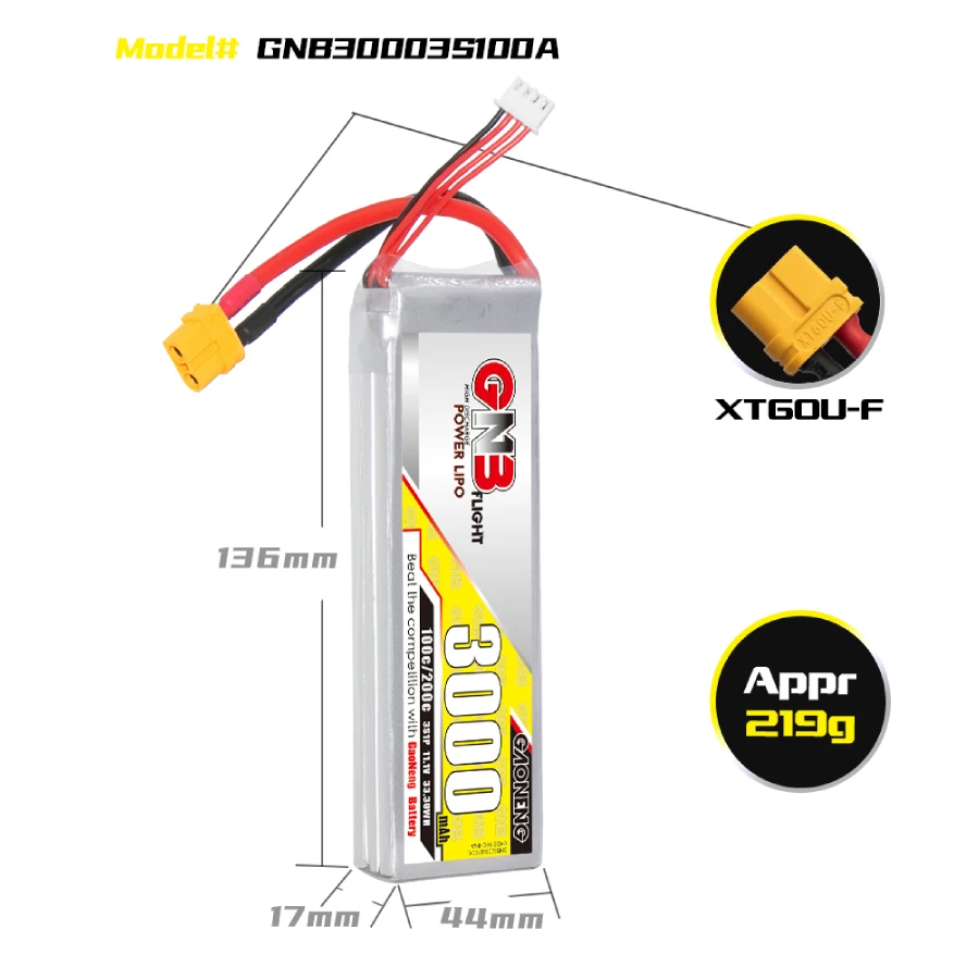 – Model: GNB 3000mAh 3S 100C LiPo Battery with XT60 connector.