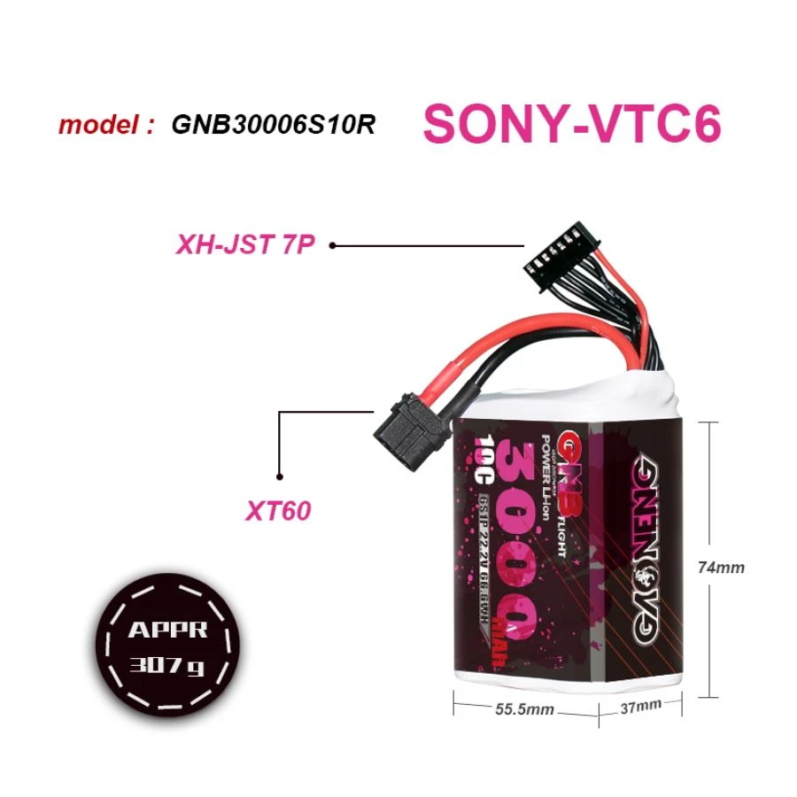 – Model: GNB 3000mAh 6S 10C Li-ion Battery with XT60 and XH2.54 (6 pin) balance connector