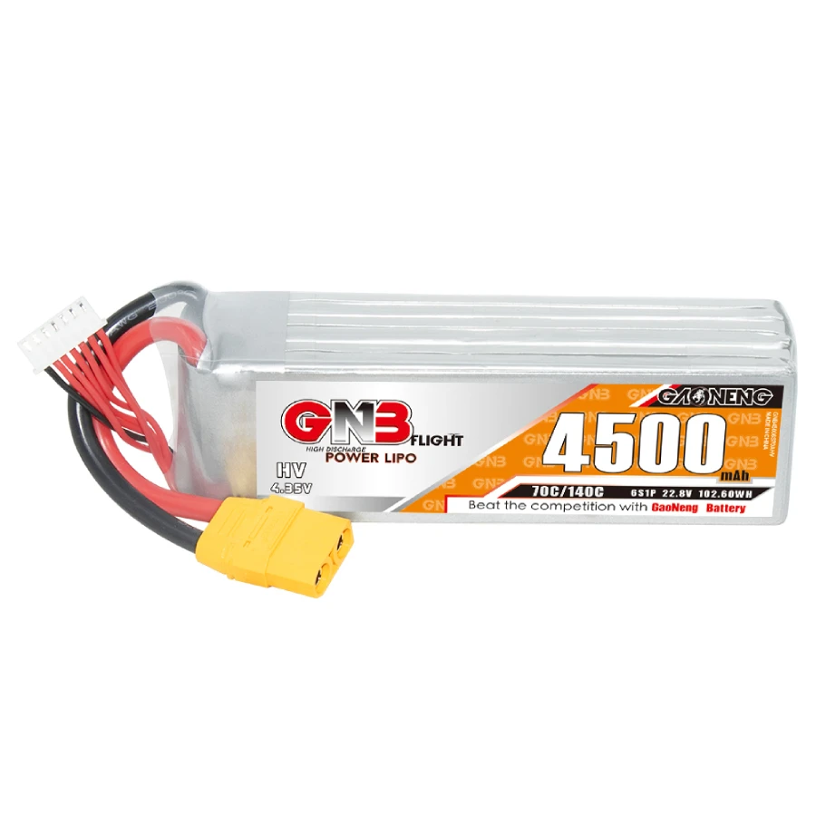 The GNB 4500mAh 6S 70C LiHV Battery is a high quality LiHV (High Voltage Lithium Polymer) battery manufacturered by Gaoneng, more commonly known as GNB. It features a rating of 70C for constant discharge upto 140C for short bursts. The battery is fitted with an XT90 connector and includes a JST-XH balance plug.
