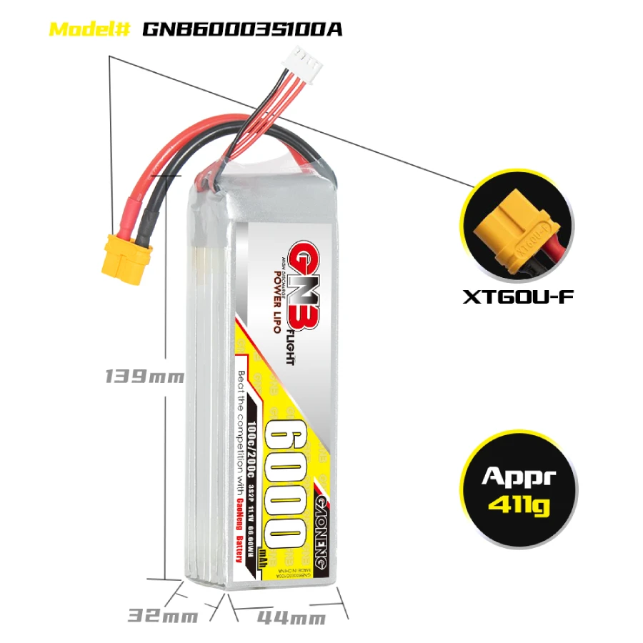 – Model: GNB 6000mAh 3S 100C LiPo Battery