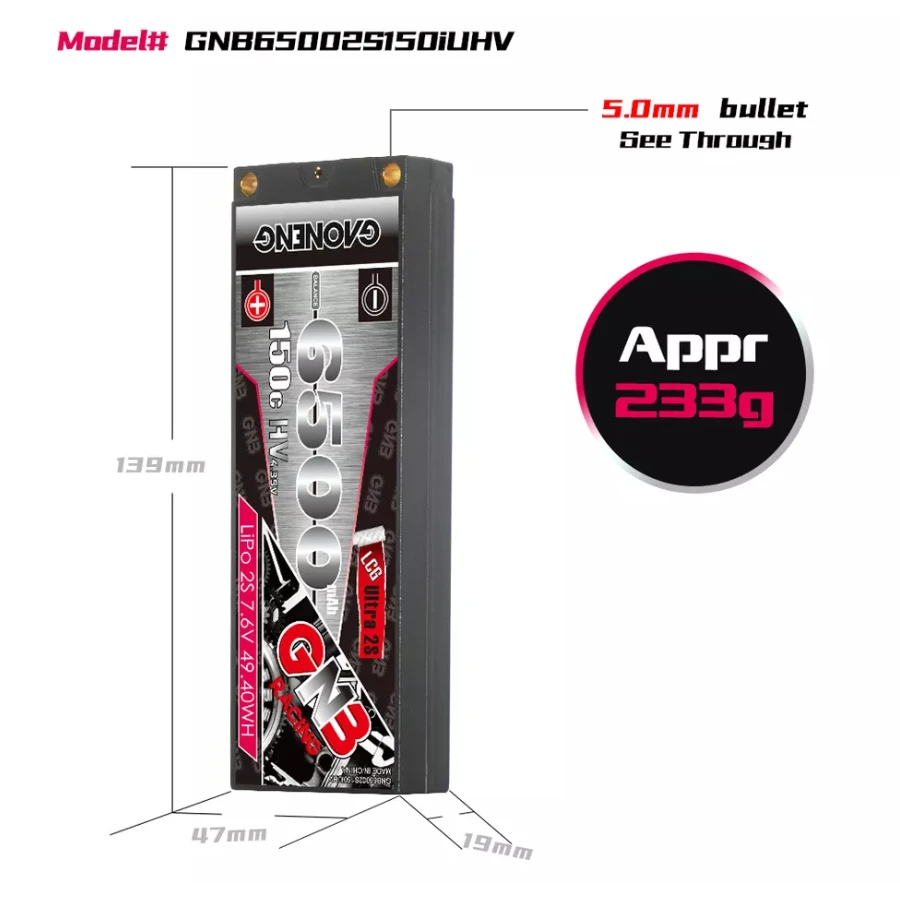 – Model: GNB 6500mAh 2S 150C LiHV Battery