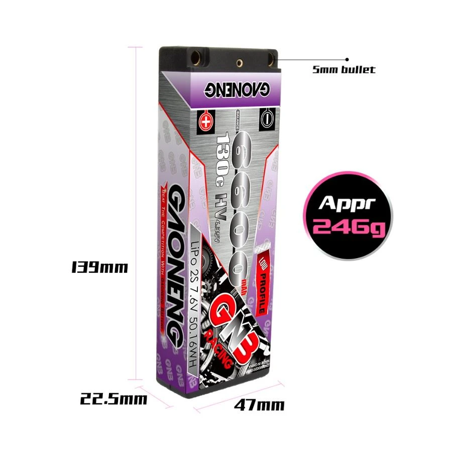 The GNB 6600mAh 2S 130C LiHV (High Voltage Lithium Polymer) Battery is a high quality LiPo battery manufacturered by Gaoneng, more commonly known as GNB. It features a rating of 130C for constant discharge upto a massive 260C for short bursts. The battery is fitted with 5mm bullet connectors. The connection wire has 5mm bullet connectors and terminates to a Deans connector with JST-XH Balance lead (2mm bullets). The connector can easily changed to an alternative connector such as an XT60 as the connector lead is removable.