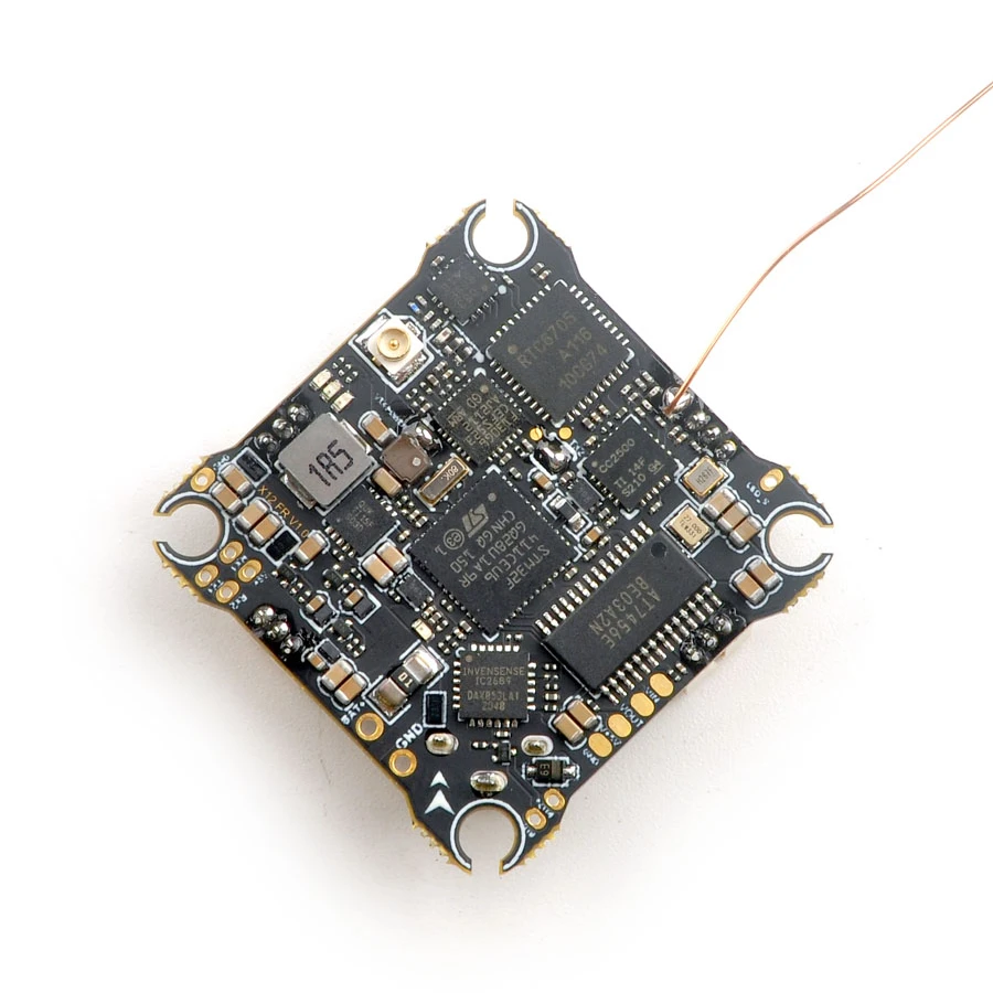 The Happymodel ELRS X12 F4 AIO is a 5in1 F4 flight controller with integrated SPI 2.4GHz ExpressLRS receiver. The flight controller integrates SPI controlled 2.4GHz ExpressLRS receiver, Dshot protocol 4-in-1 ESC, 5.8GHz 40ch video transmitter and Betaflight OSD. Ultra-small size and ultra-stable remote control range can improve the range of the original SPI receiver. And because the 2.4GHz ExpressLRS receiver is equipped with the SX1280 radio frequency chip with high sensitivity, high packet rate and low latency, this flight controller is the one that all Race/Freestyle pilots needed. It is suitable for use in Tiny whoop Race or Toothpick Freestyle and can be used with 1S or 2S LiPo or LiHV.