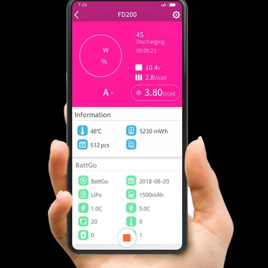 The iSDT FD-200 Smart Battery Discharger is a sleek and compact discharging solution for LiPo batteries ranging from 2s to 8s. The discharger supports a bluetooth connection on supported Android or IOS devices allowing full monitoring of the discharge process. The device also has a colourful LED display that visually shows the cell count and the progress of discharging.