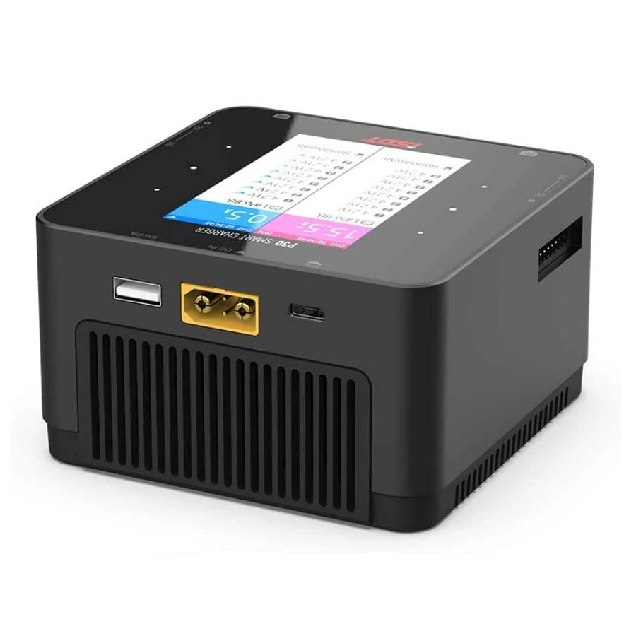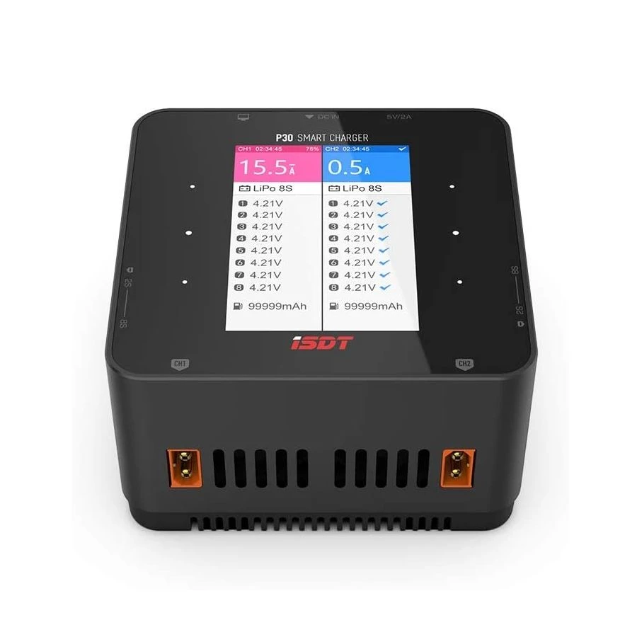 The ISDT P30 1000W DC Charger is a dual port charger capable of syncronous balance charging across two channels for a combined maximum of upto 1500W. The charger can also be used as two independent 1000W channels (Max 1500W across both channels) with different battery chemistries. The ISDT P30 delivers a charging current range from 30A to 50A. To P30 is housed in an anodised magnesium alloy shell which provides an extremely effective heat dissipation design. The desvice features a 3.5inch high resolution IPS screen and supports bluetooth connectivity for use with ISDTs mobile phone app.