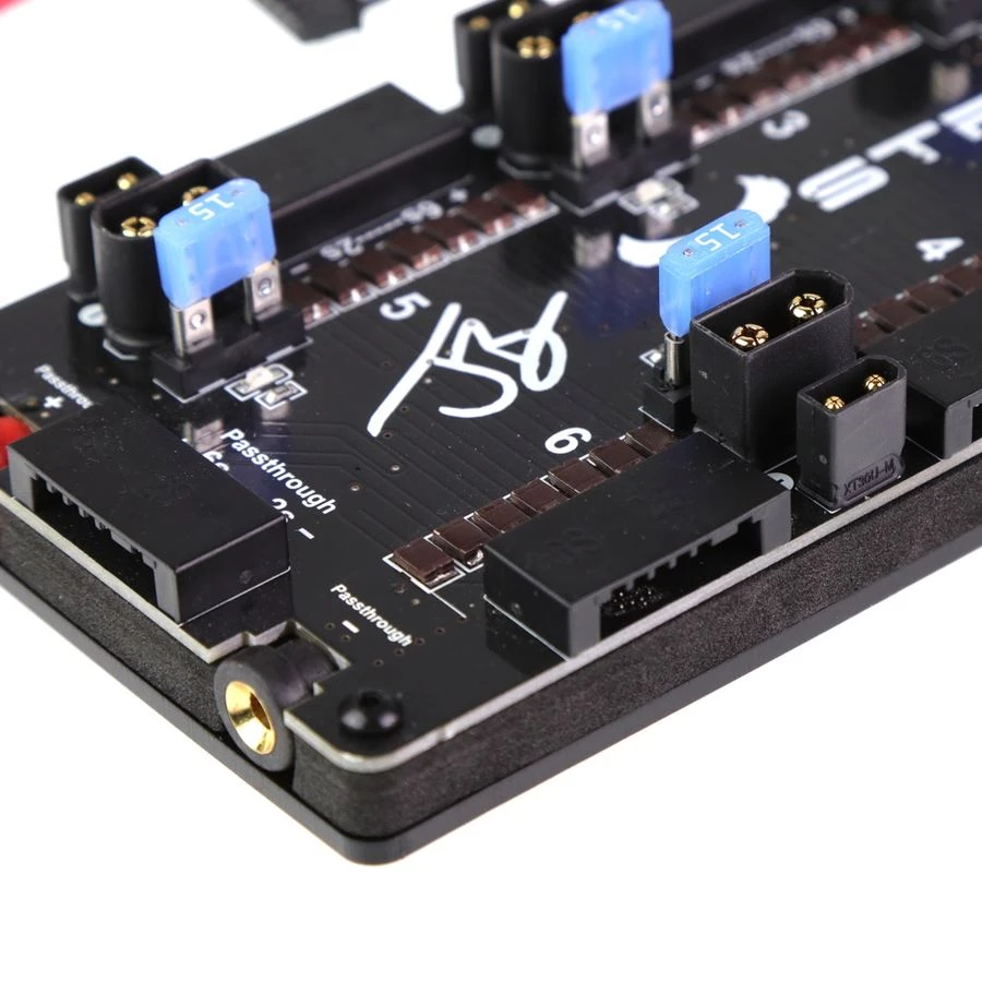 Introducing the latest parallel charging board from the Joshua Bardwell Signature line! No longer do you need to make the choice between XT60 vs XT30 or even specific number of cells when choosing a board for your parallel charging needs. All poly-fuses are equipped with color changing paint and are visible from the top side of the board. LED indicators are located on each port and illuminate if a voltage discrepancy is present while charging and the 15A fuse has tripped. Charge up to 6 batteries at once and even more with the passthrough port located at the bottom of the board. The battery checker is now completely independent of the charging circuit, allowing users to check extra packs after already plugging others onto the board.
