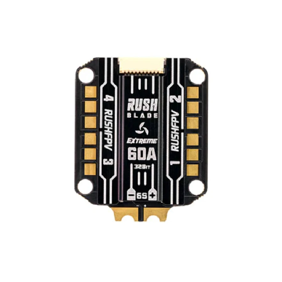 The RUSH Blade 60A Extreme 4in1 ESC is a 30.5×30.5 mounted 4in1 ESC made by RUSHFPV. It includes a high performance M4 processor and supports upto 128KHz drive Frequency.