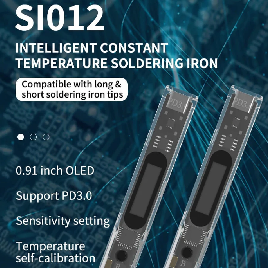 The Sequre SI012 intelligent soldering is a compact digital soldering iron, powered by compatible USB port or DC jack. The power rating is upto 68W depending on the top used and input voltage. The SI012 includes an OLED display used to display parameters such as temperature, battery voltage and working mode.