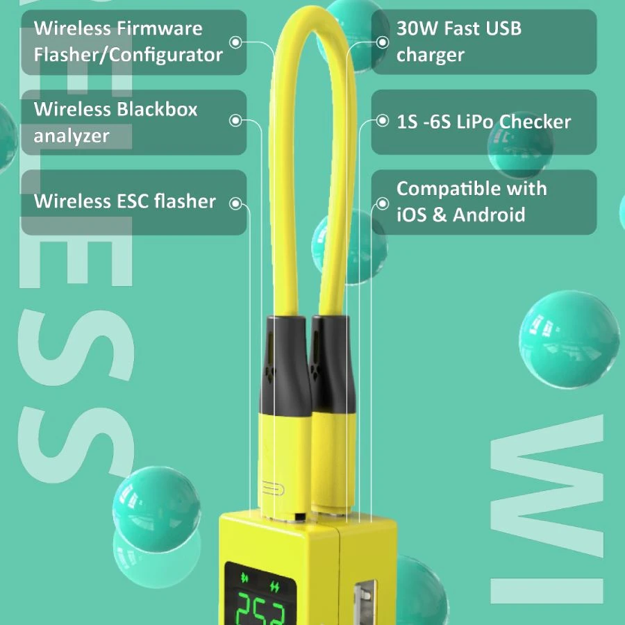 The SpeedyBee Adapter 3 is a great companion to have for in the field programming of your betaflight/INAV model. Supporting both Wifi and Bluetooth and both USB-C and MicroUSB connections. Powered by a 1S to 6S LiPo with PH2 or XT60 connector this handy device allows programming of Betaflight settings, programming of BLHeli_S & BLHeli32 ESCS (via the flight controller). The Speedybee also can act as a USB QC3 charger for in the field charging of mobile devices. The handy built in screen provides LiPo Checker functionality.