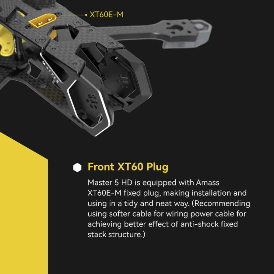 The Speedy Bee Master 5 HD frame series is designed for FPV freestyle flying. The master 5 features an innovative anti-shock fixed stack structure which help mitigate noise getting through to the gyro. The arms have a quick release mechanism to help speed up installation and repairs. The HD version of the frame has been designed with a horizontal field of view of around 130 degrees and the arms have been made slightly wider to make sure that props aren’t in view. The camera plate is detachable.