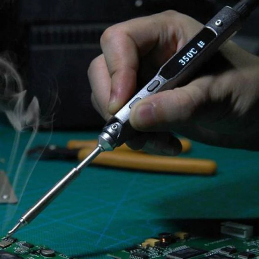 The TS100 soldering iron employs 304 stainless steel nested shell of Polycarbonate plastic. It is designed with safety circuit and anti-static structure, integrated with DC5525 12-24V port, dual-temperature sensors and accelerated sensors with STM32 chip. Under these functionalities, temperature can be controlled accurately, stably and easily adjusted from 100°C to 400°C, and the TS100 also has sleep mode and automatic over-heating warning.