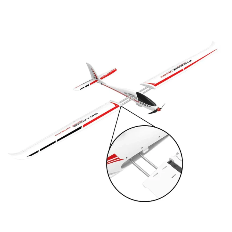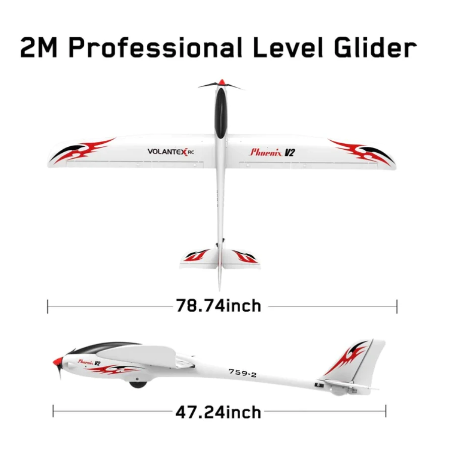 The VolantexRC Phoenix V2 Glider is 5 channel 2000mm wingspan powered glider. The wingspan makes it ideal for a gliding or soaring. The wing is an innovative click and plug detachable system making it easy to disassemble for transit to and from the flying field. The main body is made from a unibody plastic fuselage thats both lightweight and flexible in the case of crash landings.